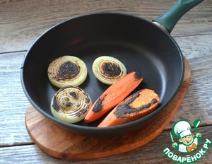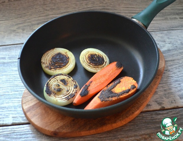На сухой сковороде подпалить кольца лука и кусочки моркови, добавить эти овощи в кастрюлю, варить при самом минимальном кипении 5-6 часов.