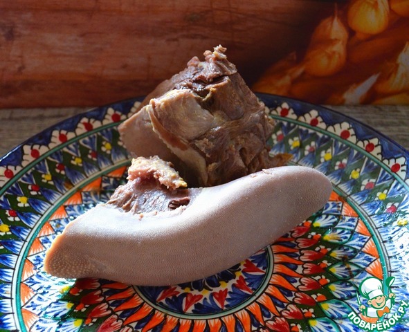 Залить холодной водой в кастрюле 5 л., добавить луковую шелуху, дать закипеть, проварить при медленном кипении 30 минут. Затем бульон слить, промыть куски, переложить в чистую кастрюлю, залить водой.