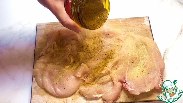 После чего приправляем его солью, черным молотым перцем, сушеным чесноком, приправой для курицы.