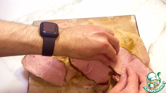 Сверху кладем слайсы ветчины и заворачиваем в рулетики.