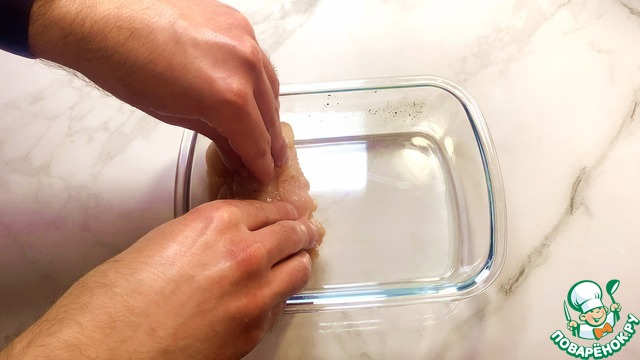 Первым делом куриное филе разрезаем в тонкий пласт.