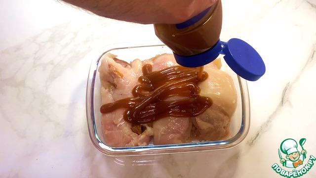 Сверху наливаем BBQ соус, равномерно размазываем его по куриным рулетикам.