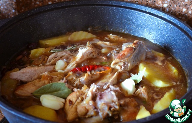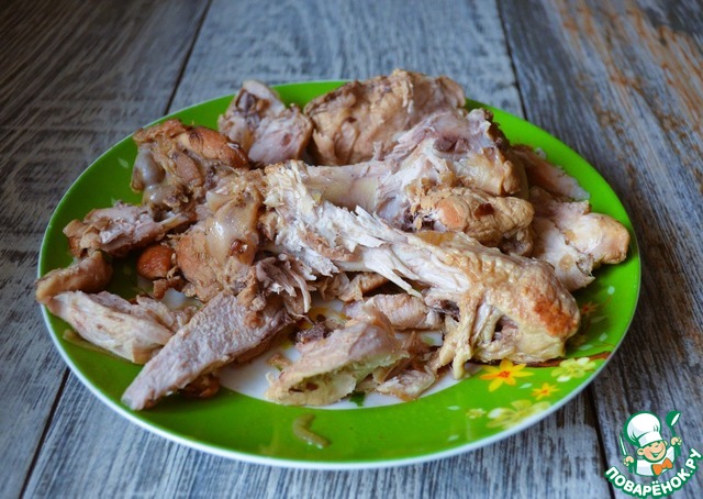 Достать индейку, снять мясо с кости. Вернуть всё в кастрюлю.