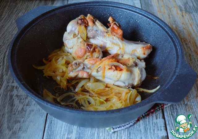 Лук почистить, нарезать перьями, добавить и обжарить на среднем огне, 3-5 минут. Влить 300 мл. кипятка, слегка посолить, дать закипеть и тушить под крышкой на медленном огне, 25 минут.