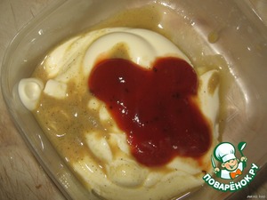 Для соуса смешать майонез, кетчуп и горчицу.