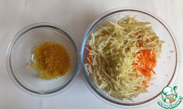 Натереть морковь и яблоко на тёрке, я натёрла на крупной (как предлагалось автором), но морковь варилась очень долго. Лучше воспользоваться мелкой тёркой. Туда же натереть имбирь.