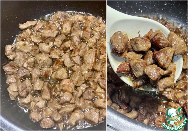 Мясо надо жарить при максимальной температуре в раскаленном масле. И как только сок мяса уйдет, добиться легкой корочки и выкладывать лук. Через пяток минут, можно снизить т-ру, но не сильно. Постоянно ворошить надо в казане содержимое. Обязательно. Тогда ничего не подгорит. Еще минут через десять т-ру убавить до 120 и морковку в казан. И ворошите, не ленитесь. Морковка дойдет быстро, вы не думайте. Минут через 15 начинайте снижать т-ру. До 100. Вороша, дайте морковке пропечься, напиаться маслом. Как только "моркошка свесит ножки", в зирвак наливаете воду, даёте начать закипать и вот тут регулировать т-ру надо вниз до состояния редкого взбулькивание. Дальше в зирвак чеснок, соль, специи. Не ПЕРЕМЕШИВАТЬ! Только от стенко отодвигать время от времени. Зирвак должен томиться на небольшом нагреве. В идеале вода почти вся выкипит, а зирвак будет прозрачным.