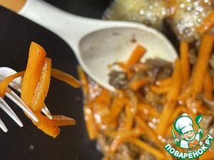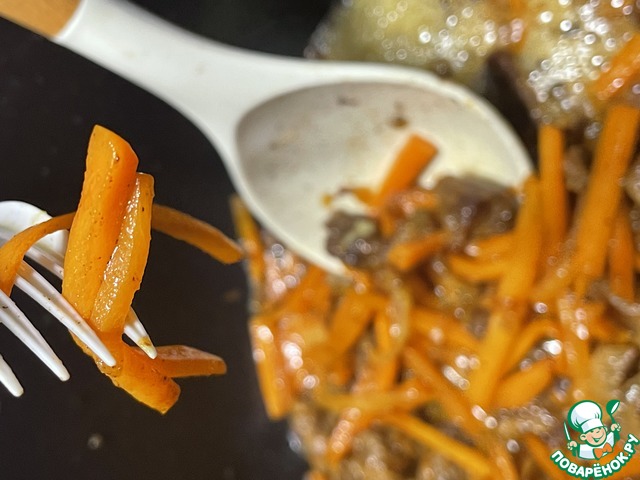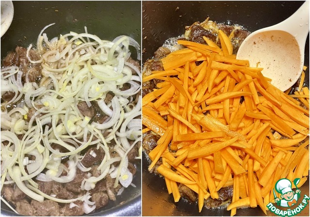 Кто-то утверждает, что после добавления морковки, именно с этого момента, зирвак перемешивать нельзя, кто-то, наоборот. Я без фанатизма, переворашиваю содержимое казана, то есть, чаши. Время от времени. Задача, чтобы морковка тоже пропеклась в этой масляно-мясной луковой смеси.