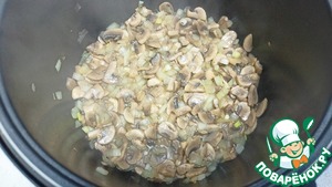 Отправляем в чашу половину масла, грибы и лук - Режим «Жарка» 15 минут (Не забываем перемешивать каждые 2-3 минуты. Исключительно с открытой крышкой).