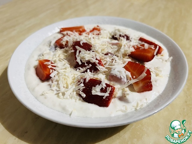Добавить полуразмороженные ягоды клубники и подавать! Благодаря холодным ягодам кокосовое молоко ещё больше загустеет и превратится в нежный кокосовый крем! Приятного аппетита!