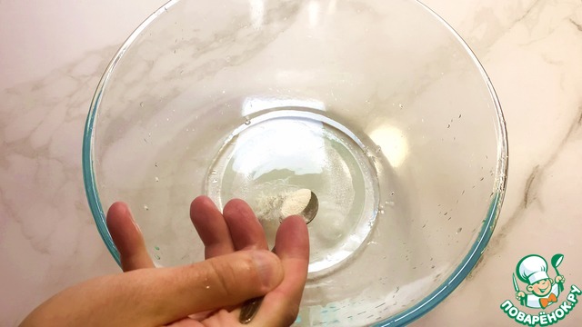 Первым делом в миску наливаем воду, добавляем немного соли, сахара, разрыхлителя.