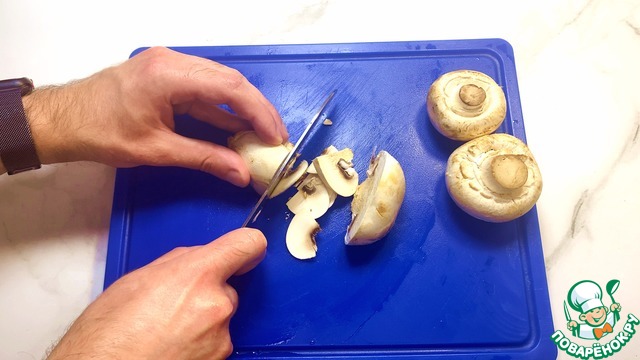 Затем шампиньоны нарезаем тонкими слайсами.