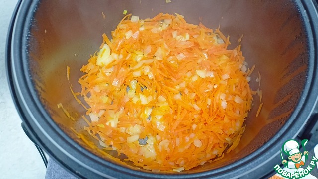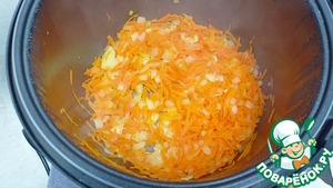 Отправляем в чашу масло, лук и морковь - Режим «Жарка» 15 минут (Не забываем перемешивать каждые 3-5 минут. Желательно готовить с закрытой крышкой).
