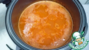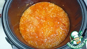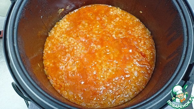 Добавляем в чашу 1 литр воды, томатную пасту и чечевицу - Режим «Тушение / Суп» 30 минут.