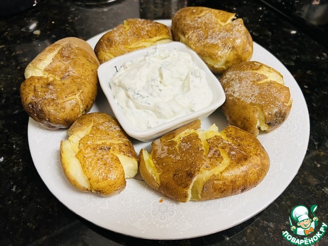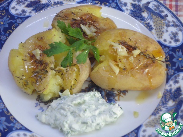 Пока картофель запекается, зелень (укроп, лук и петрушку) измельчить в блендере вместе с чесноком и соединить со сметаной. Посолить, поперчить, перемешать. Зеленый соус готов.