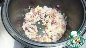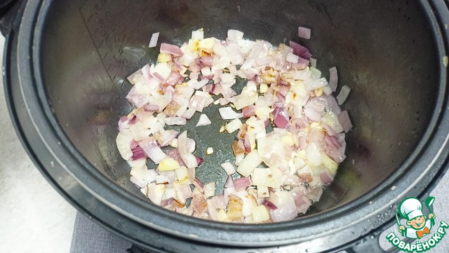 Отправляем в чашу масло, чеснок и лук — Режим «Жарка» 10 минут. (Не забываем перемешивать каждые 2-3 минуты.)