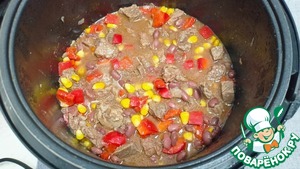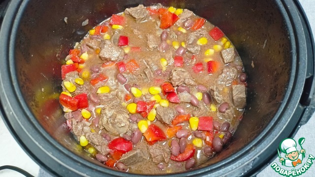 Добавляем в чашу кукурузу, фасоль и перец со специями и солью - Режим "Тушение " 30 минут.