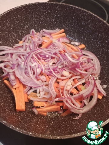 Соединяем морковку и лук в сковороде. На максимальной температуре прожариваем (у меня это на плите 9) и помешиваем.