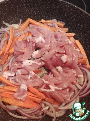 К нашей морковке с луком добавляем мясо.