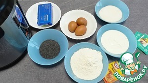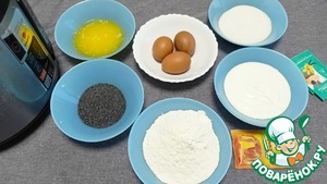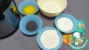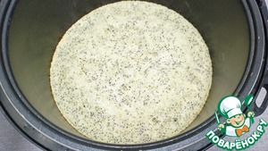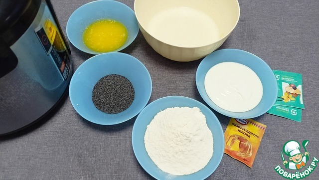 Продолжаем готовить тесто: добавляем муку, мак, разрыхлитель и ванилин — до однородного состояния. Взбиваем все это миксером 1-2 минут. Смазываем чашу масло (уйдет примерно 5гр).