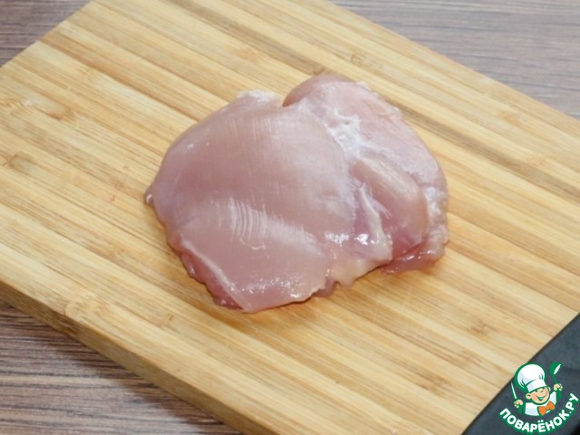 2. Из куриного филе вырезаем кусочек по размеру диаметра булочки. Можно воспользоваться кольцом для вырезки круглой котлеты.
