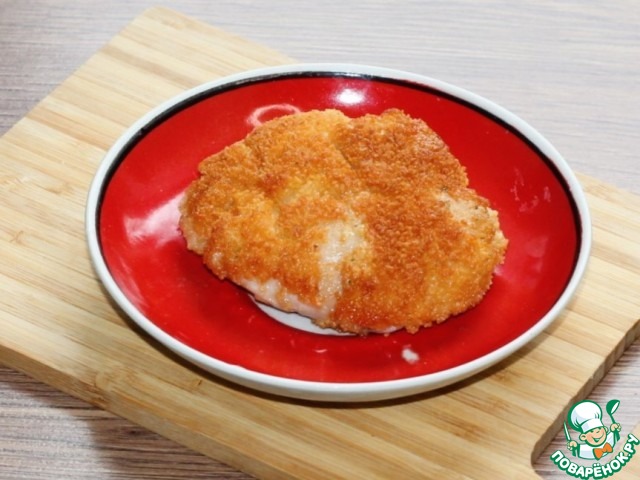 3. Приготовим 3 блюдца: в одно блюдо высыпаем панировочные сухари, во 2 - муку с приправой и 3 - взбитое с солью яйцо. Макаем кусок курицы в муку, затем в яйцо и обваливаем в панировочных сухарях.