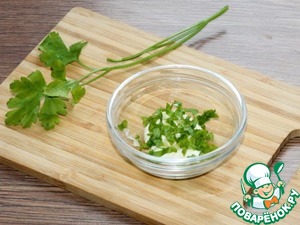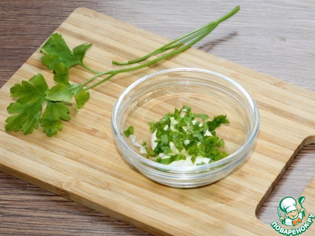 6. Приготовим соус. Смешиваем майонез с измельченным чесноком и мелко порубленной зеленью.