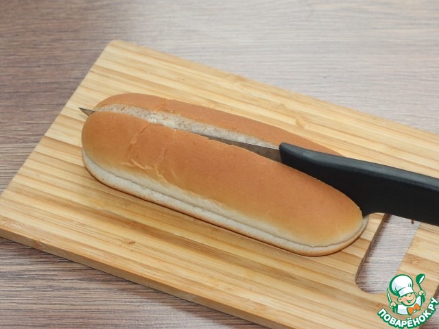 2. Булочки разрежем пополам вдоль, не разрезая полностью до конца и немного подсушим в духовке или тостере.