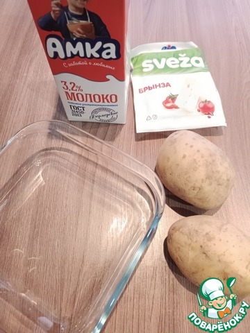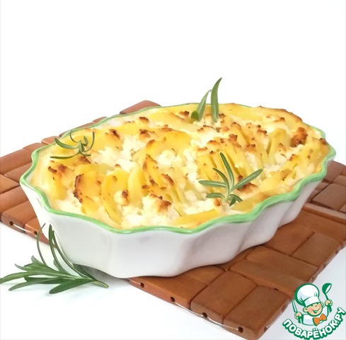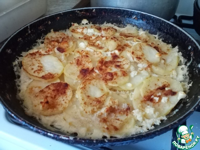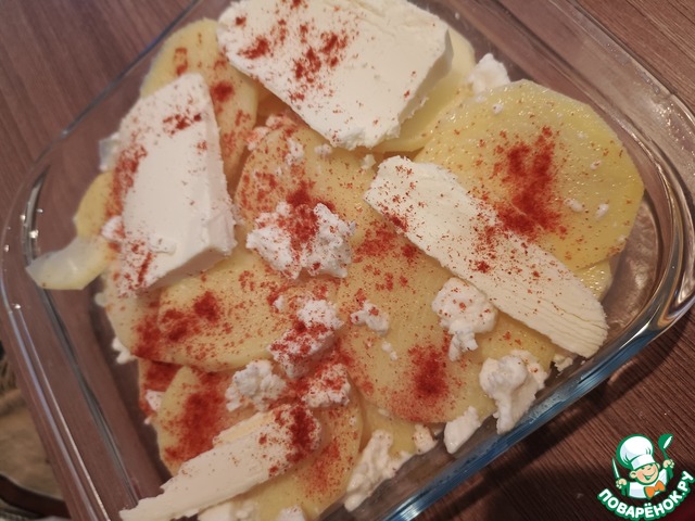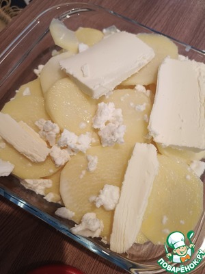 Нарезаем картофель тонкими слайсами и крошим в руках брынзу