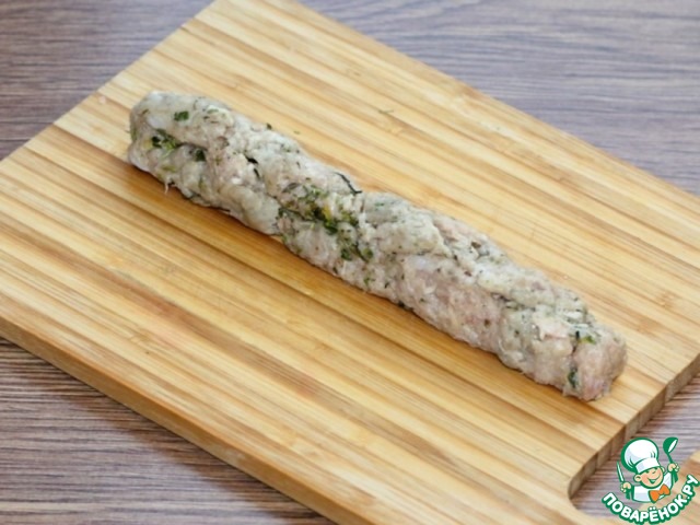 3. Затем приготовила колбаску из фарша. К фаршу добавила измельченный лук и приправу для мяса. Посолила и хорошо перемешала.