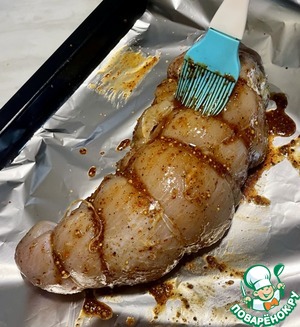 Через час фольгу вскрыл. Но только сверху, чтобы образовавшийся внутренний индюшкин сок, который будет вперемешку с маринадом не растёкся, потому что этим самым соком филейку надо будет поливать. Что я и сделал. Очень хорошо так, несколько раз. Тут, правда, усилий лучше не жалеть. Воздастся.