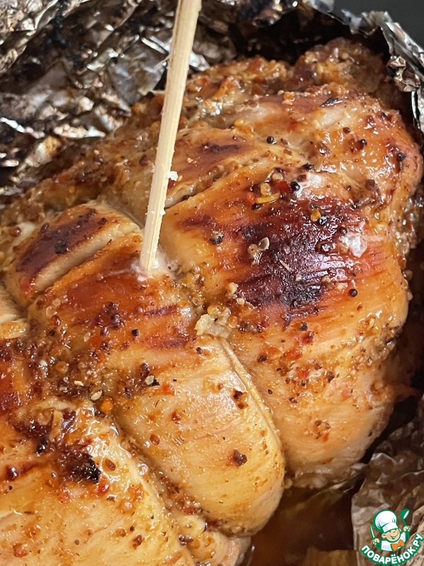 И завернул в фольгу. В два слоя. Хорошо надо заворачивать, плотно. Чтобы маринад при нагреве не просочился.