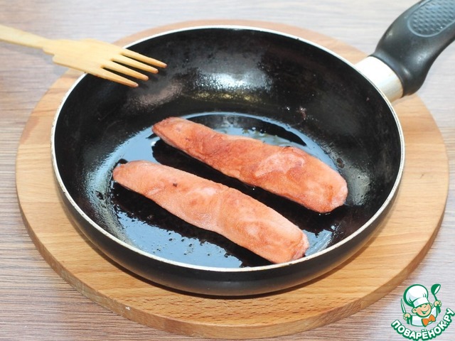 3. Сосиску разрезать пополам и пожарить на сковороде или гриле.