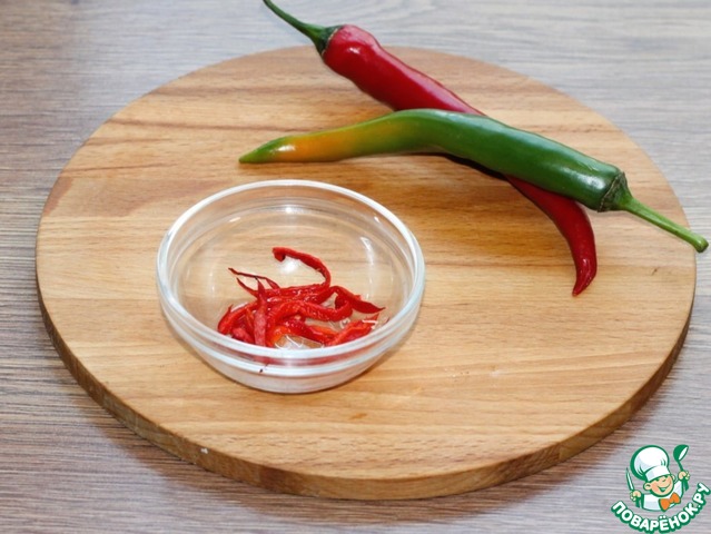 5. Перец чили обжечь на огне или запечь в духовке, охладить, удалить шкурку и семечки, нарезать полосками.