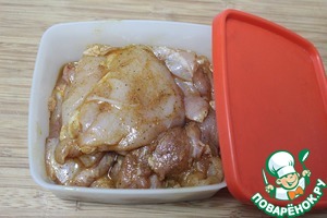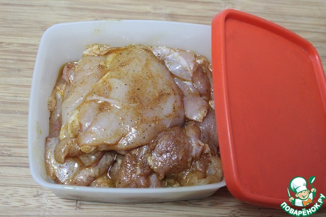 Вылить маринад на бедрышки, перемешать и убрать на холод на пару часов.