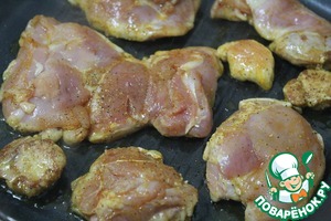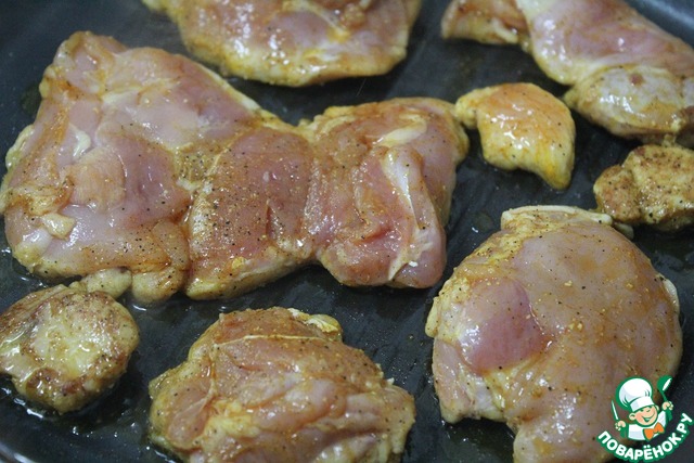 Разогреть гриль и обжарить бедрышки с двух сторон до готовности.