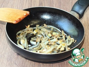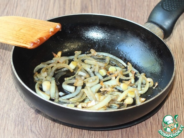 2. Лук очистить и нарезать полукольцами. Выложить его в сковороду и жарить до карамельного оттенка примерно 5 минут. Выложить лук в миску.