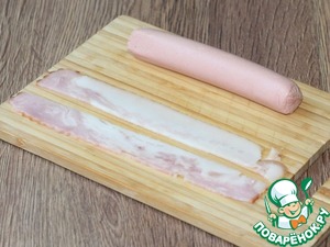 3. Полоски бекона разрезать на 2 части. Для одной сосиски надо 3 части.