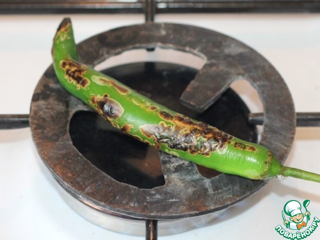 6. Перец чили обжечь на огне или запечь в духовке, охладить, удалить семечки и шкурку.