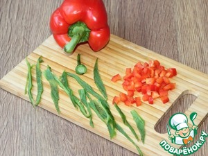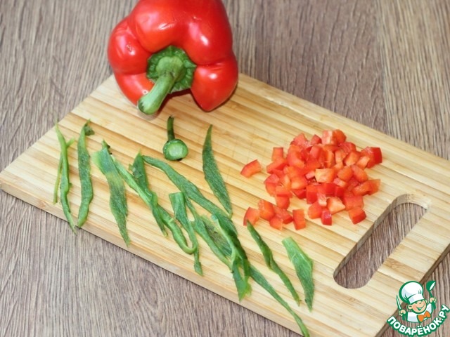 7. Болгарский и перец чили нарезать: сладкий перец маленькими кубиками, острый перец полосками.
