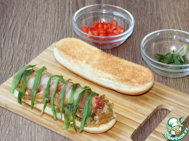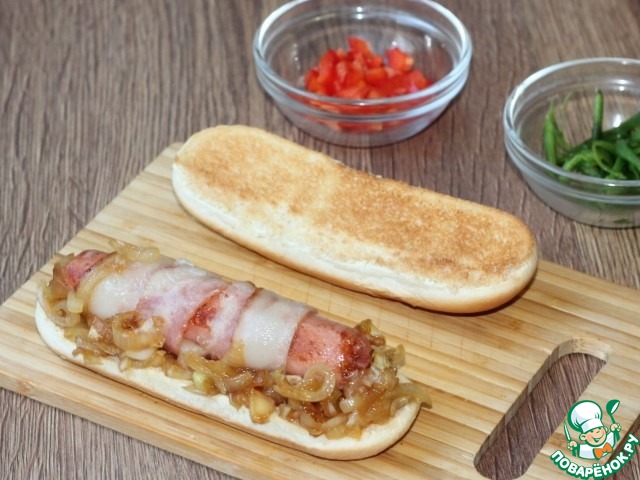 Карамелизированный лук является отличным дополнением к хот-догу, так как имеет приятный вкус, аромат и цвет. А сочетание бекона и сосиски не оставит равнодушными любителей мяса.