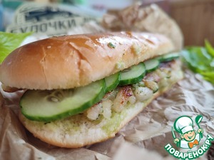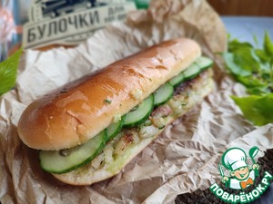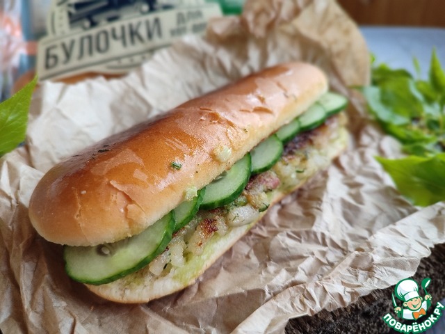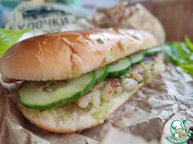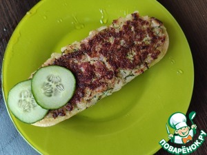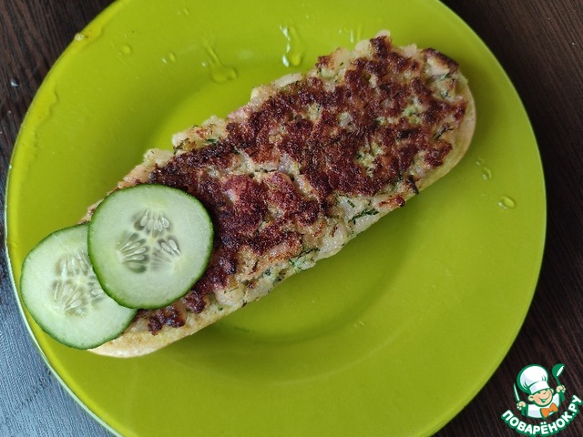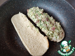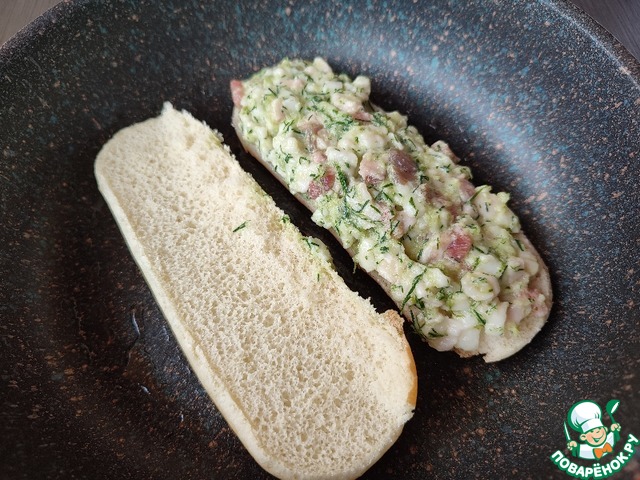Булочку раскрываем пополам и выкладываем на сковороду, предварительно смазанную растительным маслом. На нижнюю половину выкладываем массу.