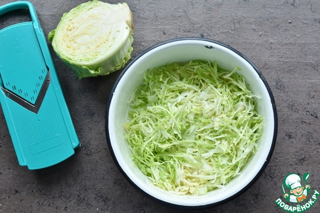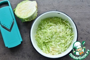 Капусту трем на терке мандолине, либо нарезаем ножом тонкой соломкой.