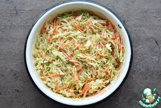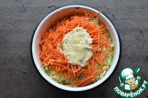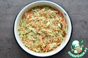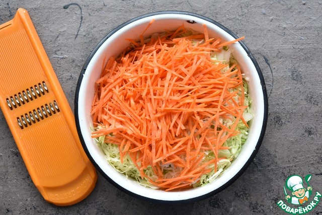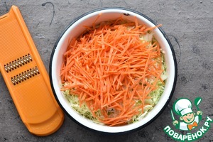 Натираем морковь и соединяем в емкости с подготовленной капустой.