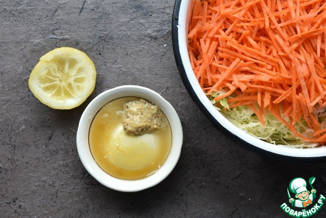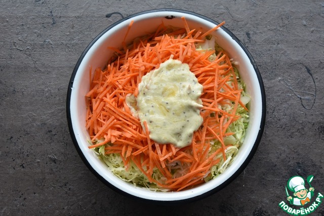 Заправку добавляем в капустный салат и тщательно перемешиваем.