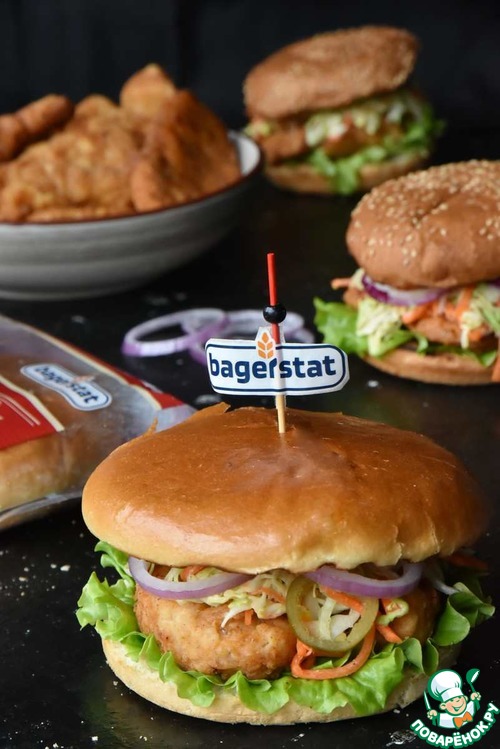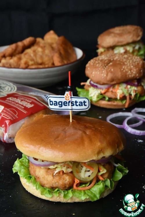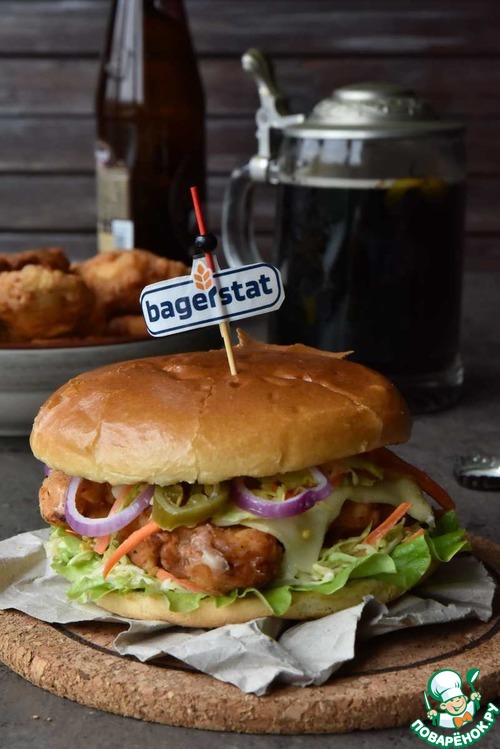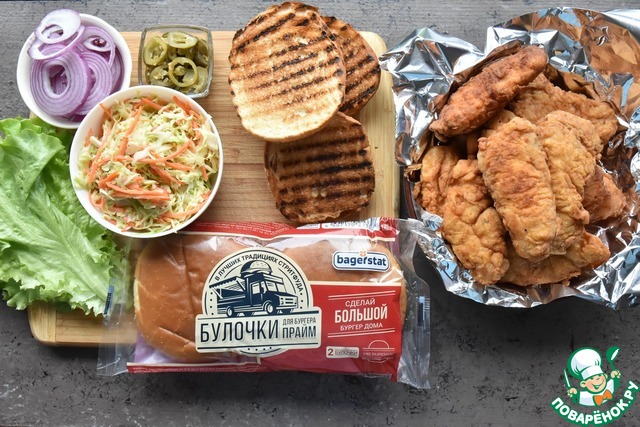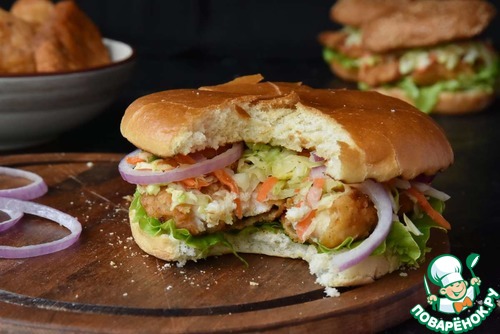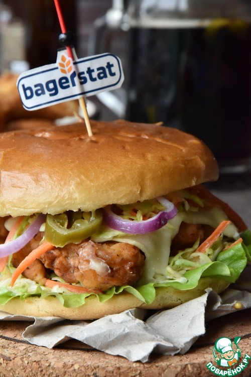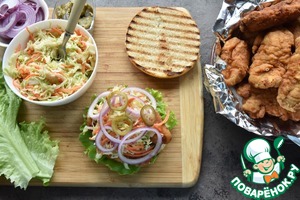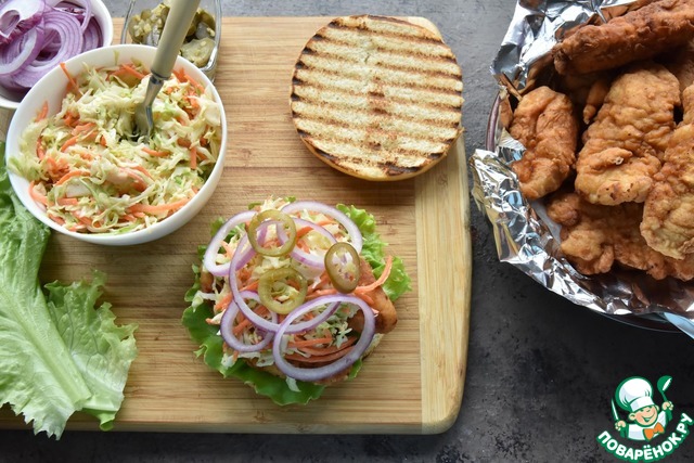 На нижнюю часть булочки укладываем лист салата, немного капустного салата Coleslaw, пару кусочков хрустящей курицы, ломтик сыра, снова салат, колечки красного лука и перца халапеньо. Сверху накрываем верхней частью булочки!