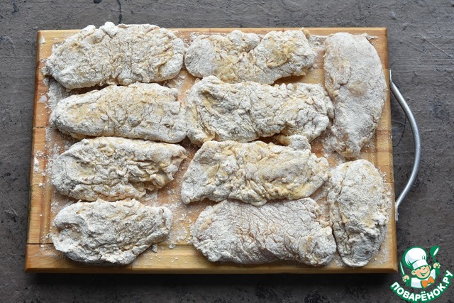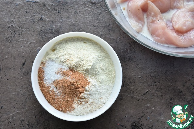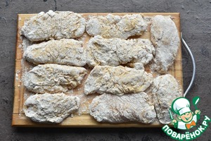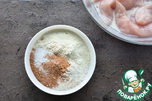 Каждое филе достаем из маринада и панируем в муке со специями. Чтобы смесь лучше держалась рекомендую поместить курицу на насколько минут в морозильную камеру.