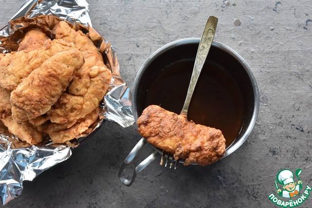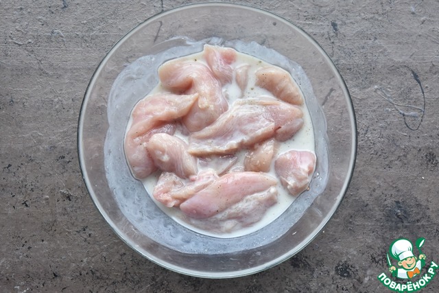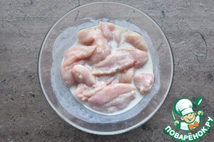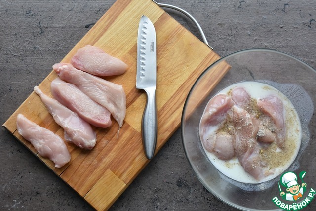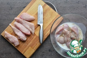 Филе зачищаем от сухожилий, лишнего жира и нарезаем полосочками. С каждого филе получается пять кусочков.