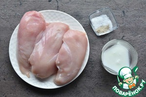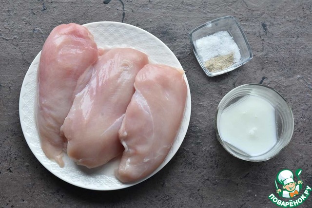 Потребуется три филе куриной грудки, кефир, соль и молотый белый перец. кефир можно заменит йогуртом без добавок. -