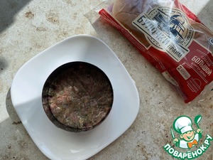200 г (1 порция) отбитого фарша выложите в сервировочное кольцо нужного размера высотой примерно 2 см, разровняйте поверхность, сделав в центре котлеты небольшое углубление.